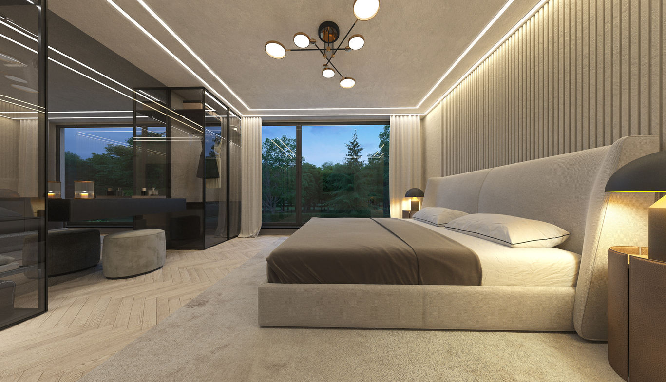 The design combines bright, clean lines with huge glass surfaces that invite the outside in. The house is flooded with natural light, showing off the impeccable interior finishes, with sleek natural stone forming open, minimalist spaces that add a visual style of homely comfort.
